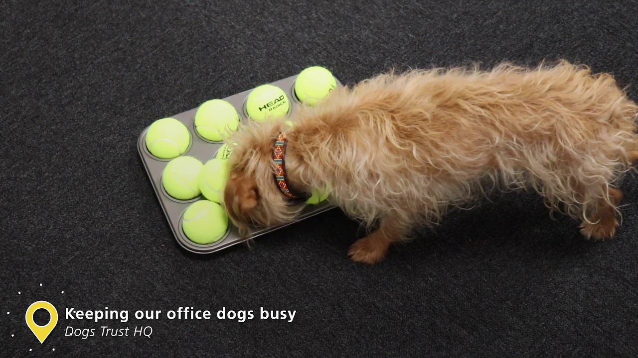 - Put the tray on the floor near your dog. Encourage them to search under the tennis balls and sniff out the treats.